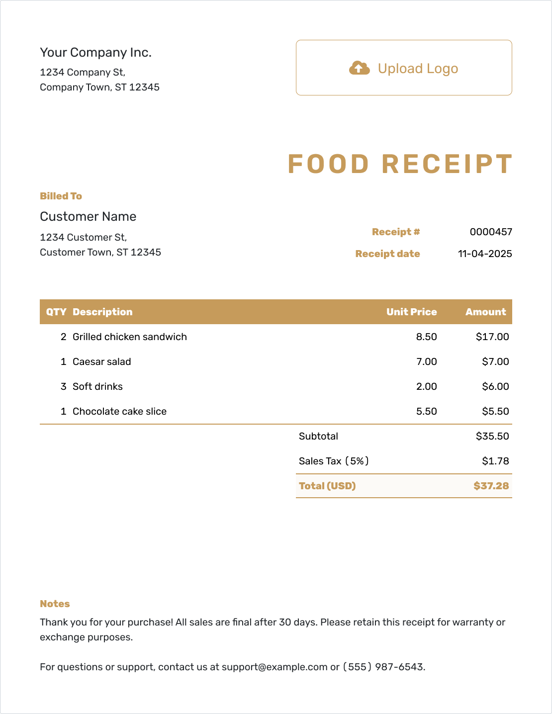 List the food items sold, the quantity, and the price for each. Include the date of sale, the customer’s name, and the total paid. A complete receipt makes it easier to track your sales and keep your customers happy.