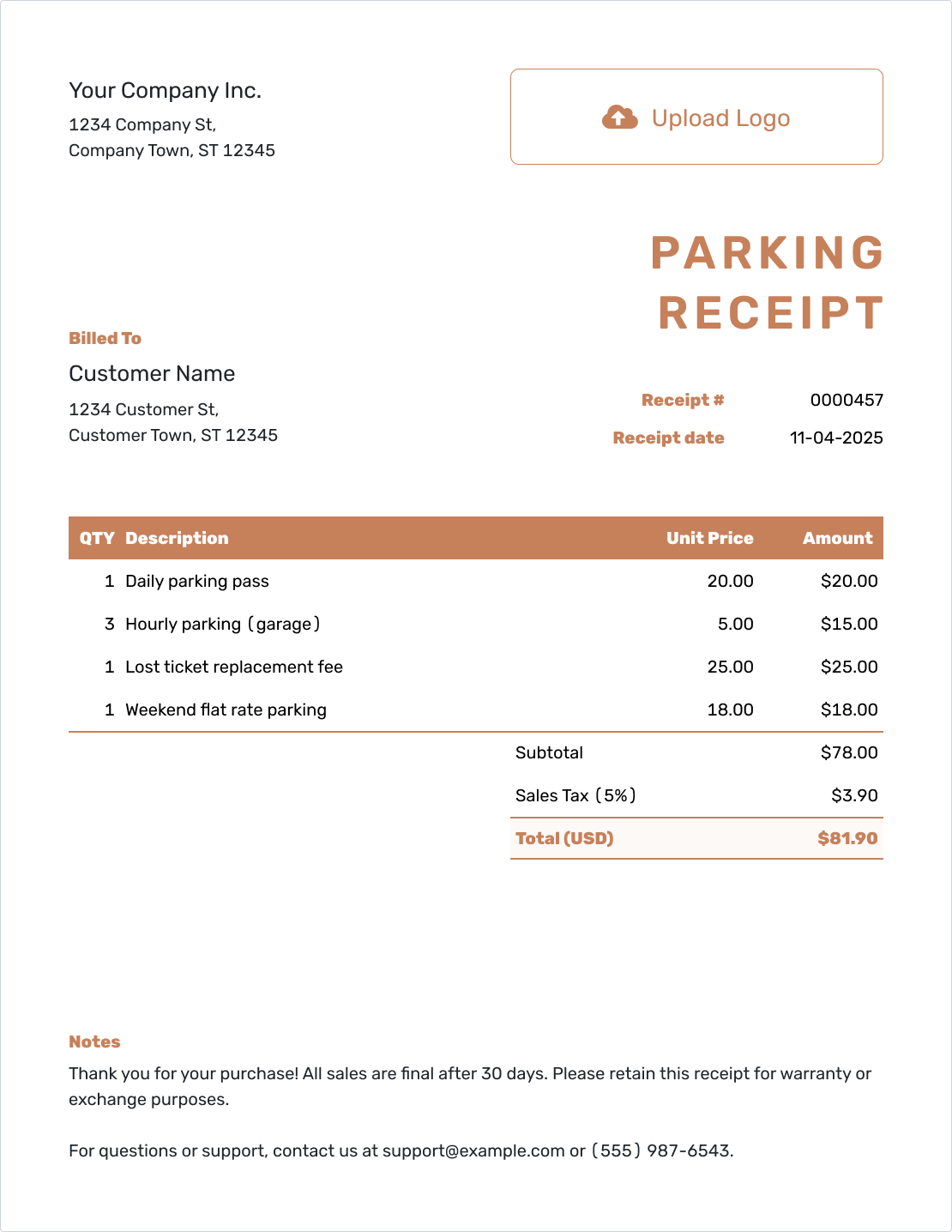 Whether you run an hourly parking lot, a valet service, a monthly garage, or event parking, a clear receipt shows that you are organized and professional.
