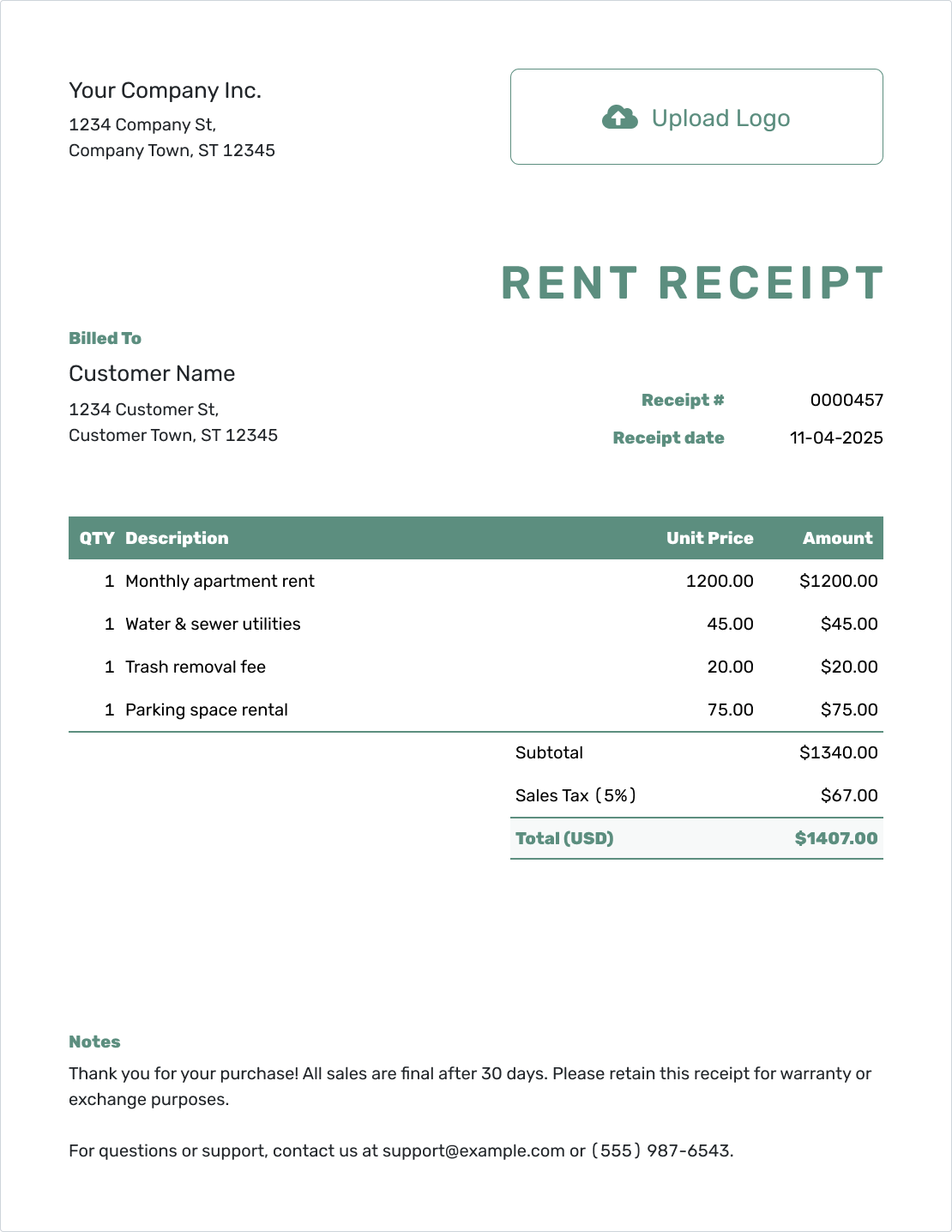 A neat, professional rent receipt shows your tenants that you take their rental experience seriously — from move-in to move-out.
